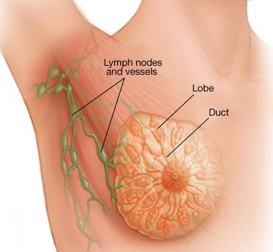 कैंसर लोब्यूल्स (lobules) या स्तन के नलिकाओं में बनता है। लोब्यूल्स ग्रंथियां हैं जो दूध का उत्पादन करती हैं, और नलिकाएं वे मार्ग हैं जो ग्रंथियों से निप्पल में दूध लाते हैं।